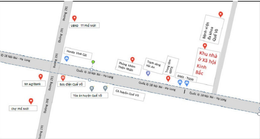 Vị trí Nhà ở xã hội Kinh Bắc Quế VõHạ tầng dự án được đầu tư đồng bộ, đối diện phía trước dự án là hệ thống đường bộ rộng 9m, trong đó 4m là lối đi bộ. Bên trong dự án có nhà để xe, khu vui chơi trẻ em, vườn cản quan,.. Dự án Khu nhà ở xã hội Quế Võ gần chợ Phủ, chợ Phố Mối, trường mẫu giáo, dãy cửa hàng bán lẻ, phục vụ cho nhu cầu của cư dân.